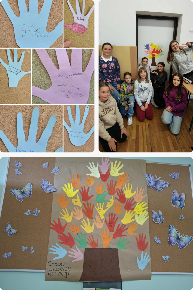 Jednym z najbardziej wzruszających działań było stworzenie „Drzewa Dobrych Relacji”. Uczniowie z klas 1–8 wypisali na kolorowych dłoniach miłe słowa i życzenia dla innych, a następnie wspólnie stworzyli wielkie drzewo, które ozdobiło szkolny korytarz. To piękna metafora – im więcej dobrych słów, tym silniejsze i bardziej rozłożyste drzewo naszych relacji. - Podsumowanie akcji